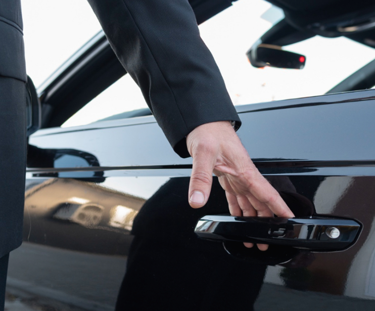 Motorista uniformizado e devidamente identificado, falando português, portando placa com o nome do passageiro e da empresa, para facilitar o reconhecimento.